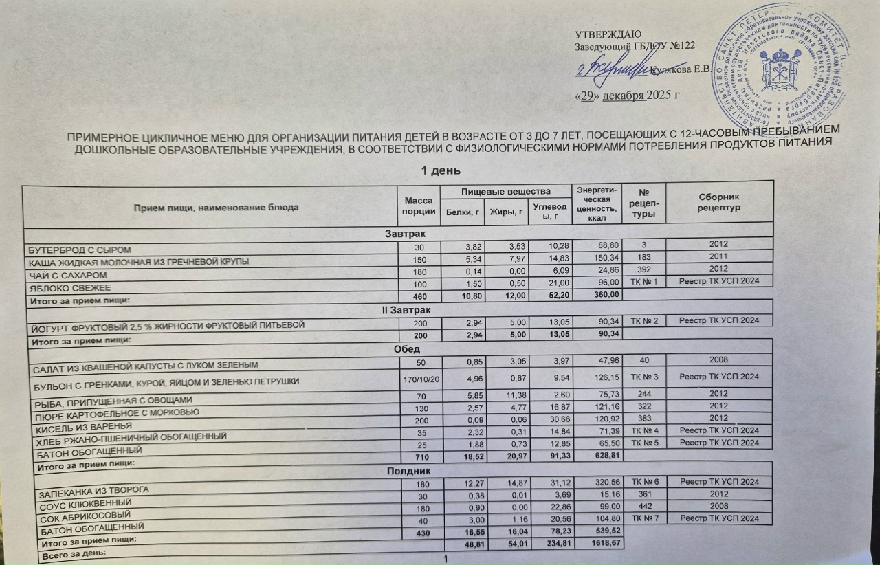Организация питания в ГБДОУ детском саду №122 Невского района Санкт-петербурга соответствует санитарно-эпидемиологическим правилам и нормативам. В ГБДОУ организовано 4-ти разовое питание в соответствии с десятидневным меню, составленным с учетом рекомендуемых среднесуточных норм питания для двух возрастных категорий: для детей с 2 до 3-х лет и для детей от 3 до 7 лет, разработанное Управлением социального питания Санкт-Петербурга.