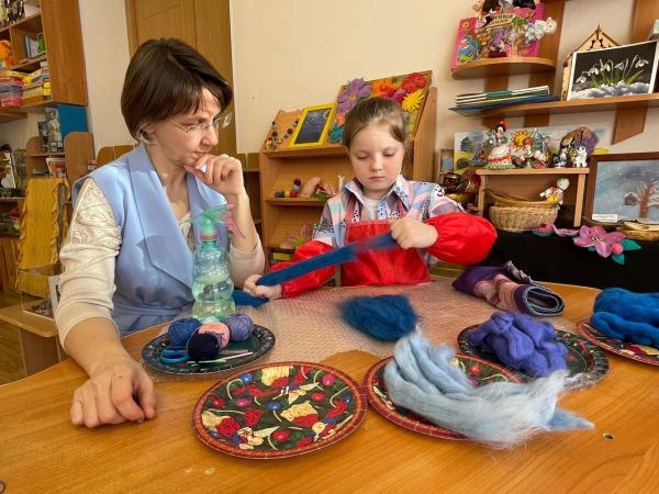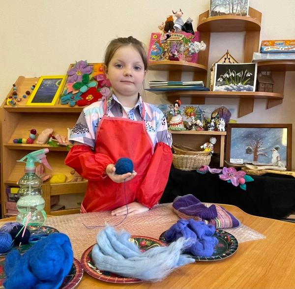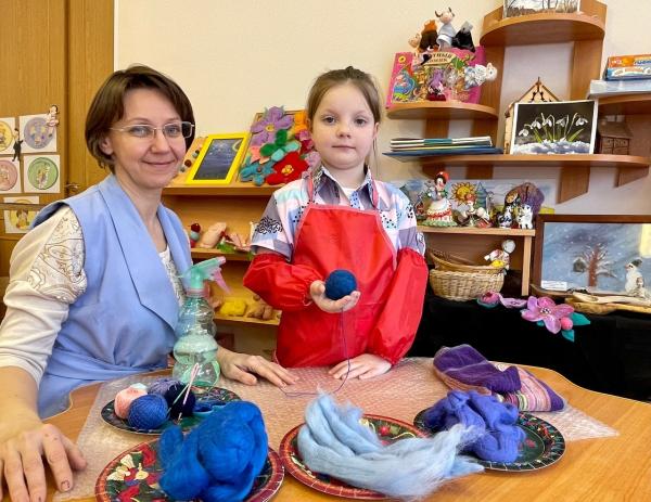 Педагог- наставник и участник представляют компетенцию «Юный мастер по валянию шерсти»(выполнение работы в технике мокрого валяния).