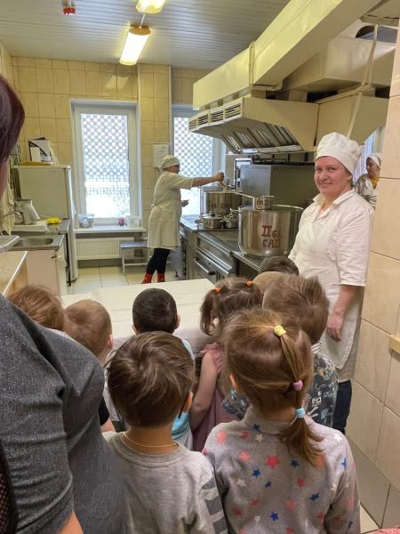 Педагоги продолжают работу в направлении ранней профориентации. Воспитанники средней группы №8 побывали на экскурсии на пищеблоке детского сада.Ребята узнали, как организована работа «Поваров».