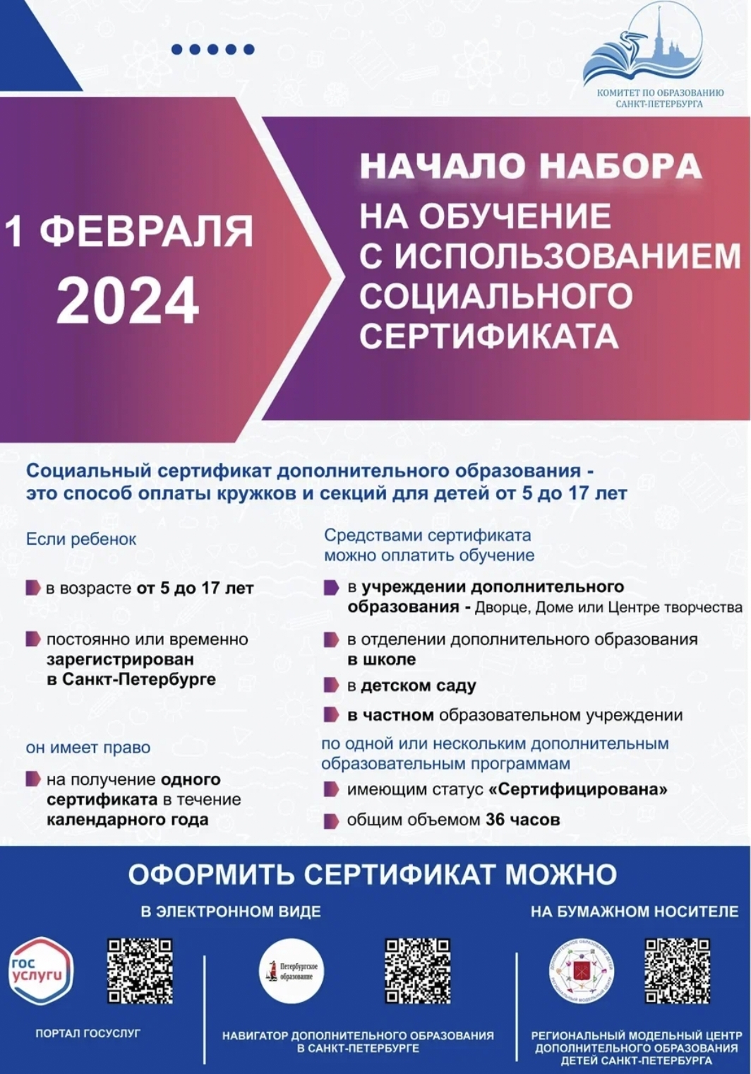 В рамках персонифицированного финансирования дополнительного образования детей в Санкт-Петербурге, созданы краткосрочные программы дополнительного образования (12 часов), которые вошли в реестр сертифицированных программ Санкт-Петербурга. Для записи на указанные программы родители обучающихся (в возрасте от 5 до 18 лет) должны получить на портале государственных услуг бесплатный сертификат на оплату обучения за счет средств бюджета Санкт-Петербурга и прикрепить сертификат в ИС "Навигатор ДО" к выбранной программе.