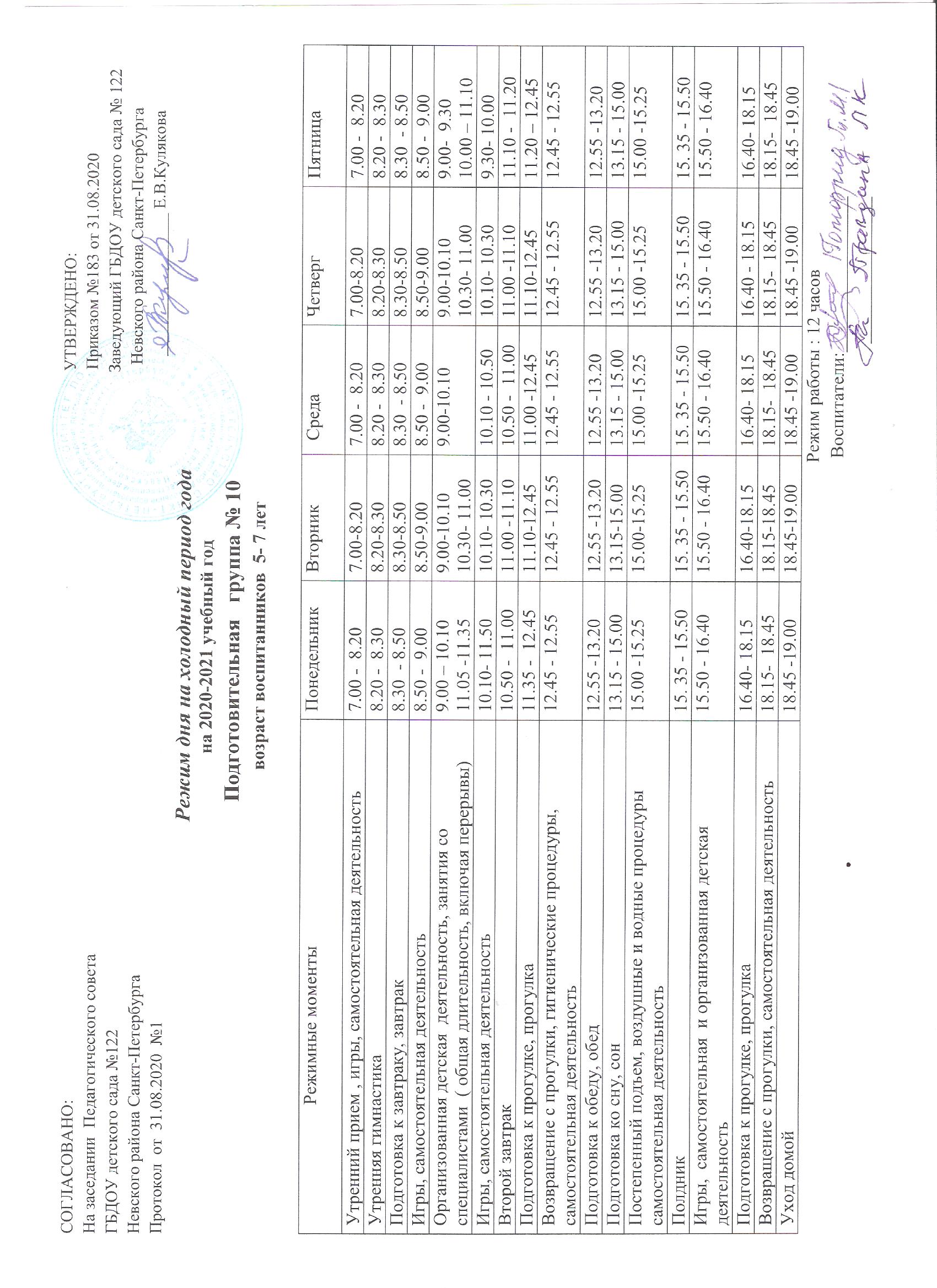 Режим дня на холодный период подготовительная группа № 10