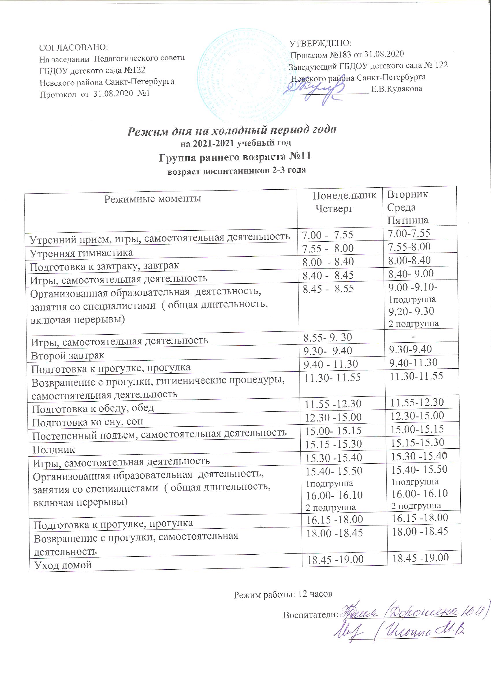Режим дня на холодный период группа раннего возраста № 11