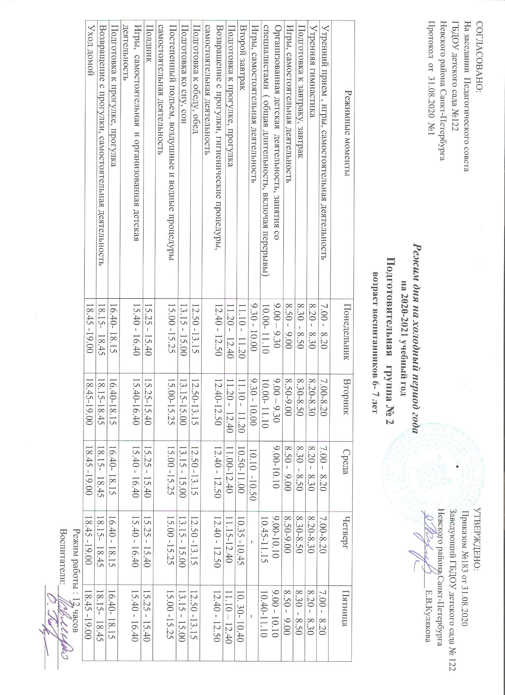Режим дня на холодный период подготовительная группа № 2
