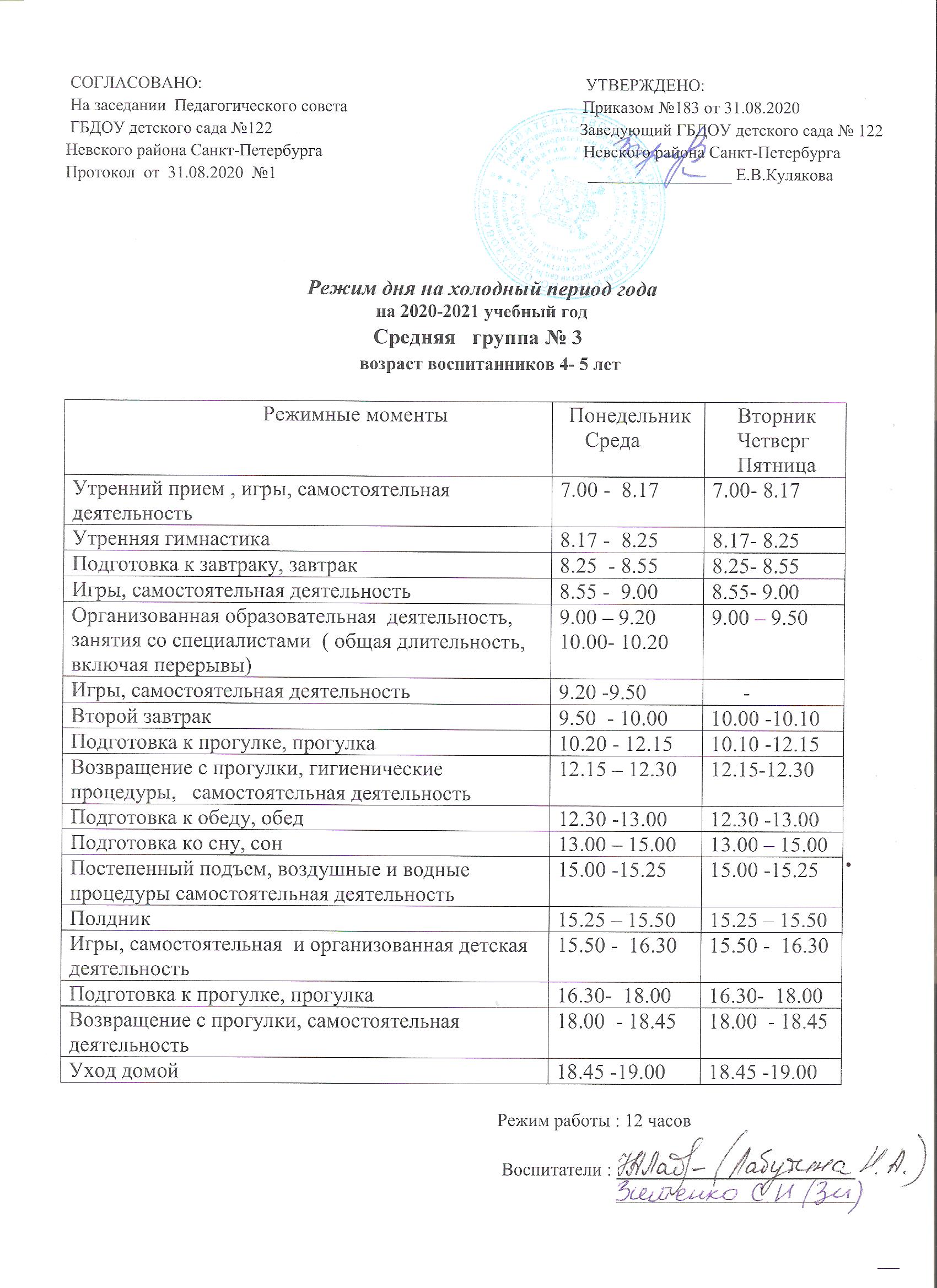 Режим дня на холодный период младшая группа № 12
