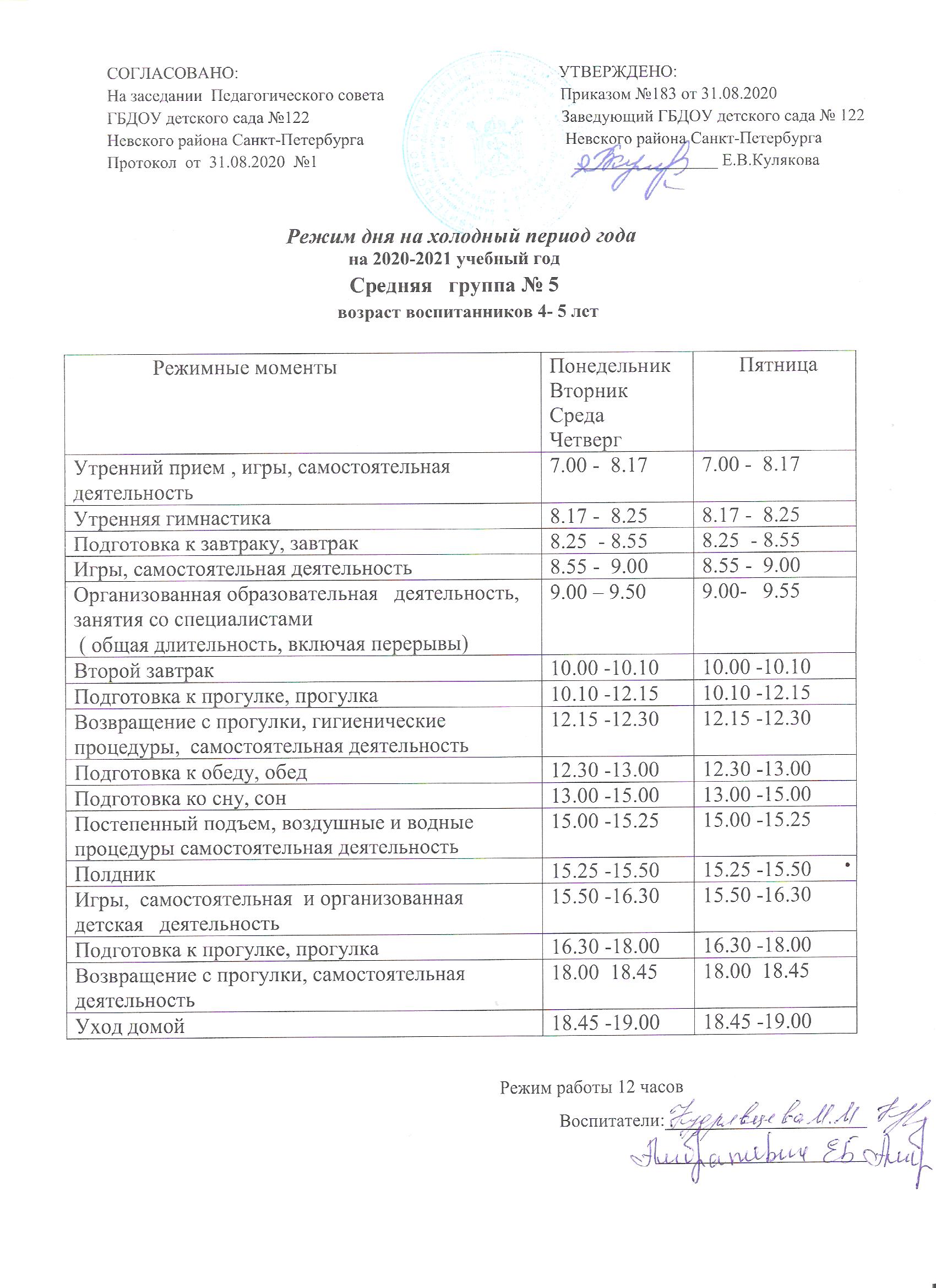 Режим дня на холодный период средняя группа № 5