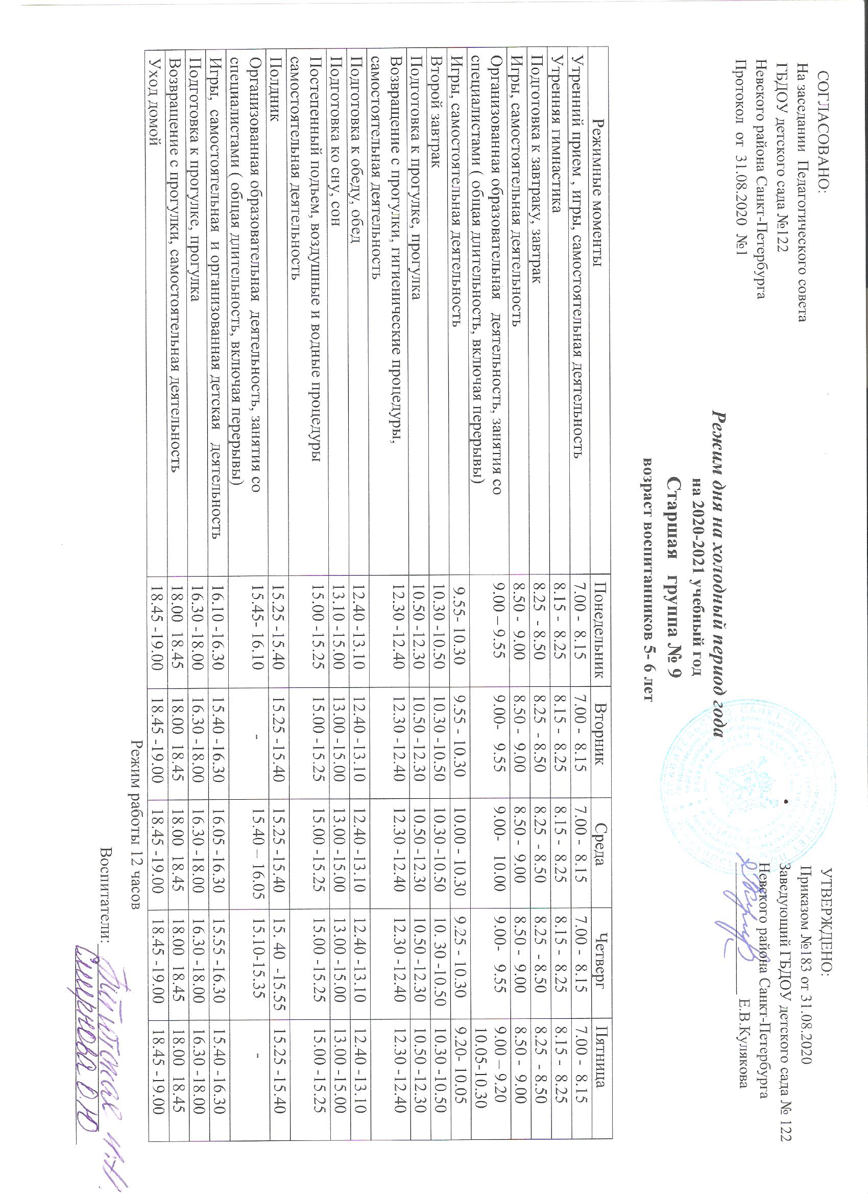 Режим дня на холодный период старшая группа № 9