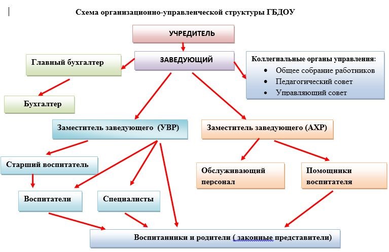 Управление ГБДОУ осуществляется в соответствии с законодательством Российской Федерации и Уставом ГБДОУ, строится на принципах единоначалия и коллегиальности. Единоличным исполнительным органом Образовательного учреждения является руководитель Образовательного учреждения – заведующий Образовательным учреждением, прошедший соответствующую аттестацию и назначенный администрацией района в порядке, установленном Правительством Санкт-Петербурга. Коллегиальными органами управления Образовательным учреждением являются: -Общее собрание работников Образовательного учреждения - Педагогический совет Образовательного учреждения) - Управляющий совет Образовательного учреждения В целях учета мнения родителей (законных представителей) воспитанников создается Совет родителей (законных представителей) воспитанников. Мнение совета учитывается при принятии локальных нормативных актов Образовательного учреждения, затрагивающих права воспитанников, а также в иных случаях,предусмотренных действующим законодательством об образовании. (Положение ) |